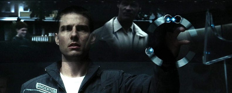 One of the most famous examples is the user interface in Minority Report. The movie has been highly influential in shaping public perceptions of interfaces and has inspired real-world applications of gesture-based interfaces and other emerging technologies. Most remember the gestural interface used by Tom Cruise’s character, what’s not widely known is the computer system used in the movie. John Underkoffler of Oblong Industries created the g-speak Spatial Operating Environment, which uses natural gestures — no keyboard, mouse, or command line. Underkoffler also worked on the gestural holographic interfaces in Iron Man (2006).